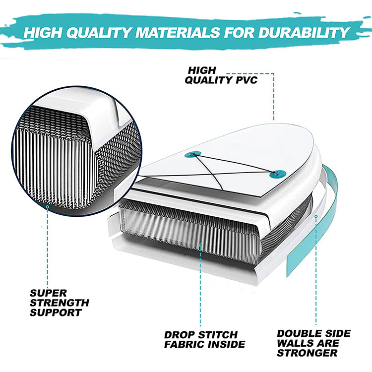 A: "드롭 스티치(Drop Stitch)" 구조를 사용하는 PVC로 만들어지며 팽창되면 기존의 에폭시 패들 보드와 유사하게 매우 단단해집니다.